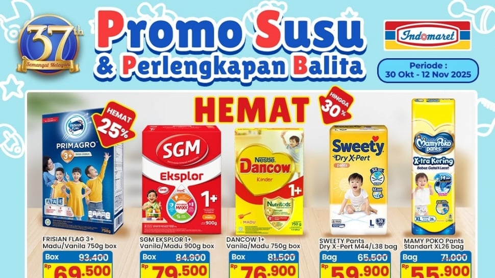 Mulai tanggal 30 Oktober hingga 12 November 2025, Indomaret menghadirkan Promo Susu dan Perlengkapan Balita yang menawarkan diskon hingga 30% untuk berbagai produk pilihan.